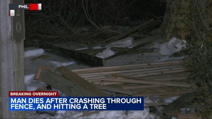 Officials say a man had to be extricated after his vehicle went through a fence, and hit a tree on the front lawn of a house in Philadelphia's West Mount Airy neighborhood.