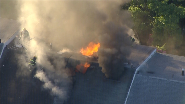 Officials said heavy flames were showing on the first floor of the middle of the row house.