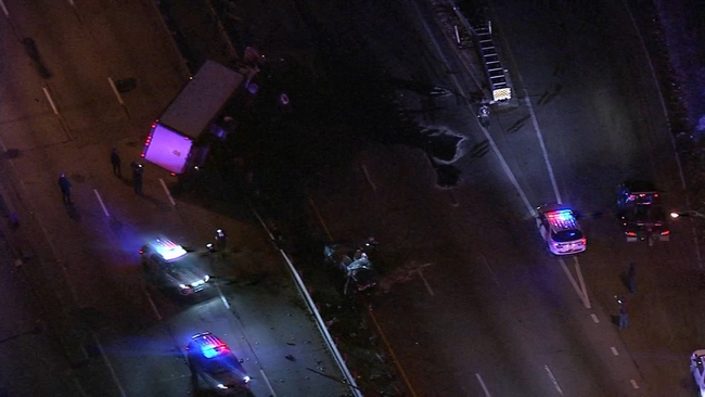 The truck, meanwhile, veered off the road, ripped off the guardrail along a 40-yard stretch, and came to a rest teetering on the median into the northbound lanes, while leaking fuel onto the roadway.
