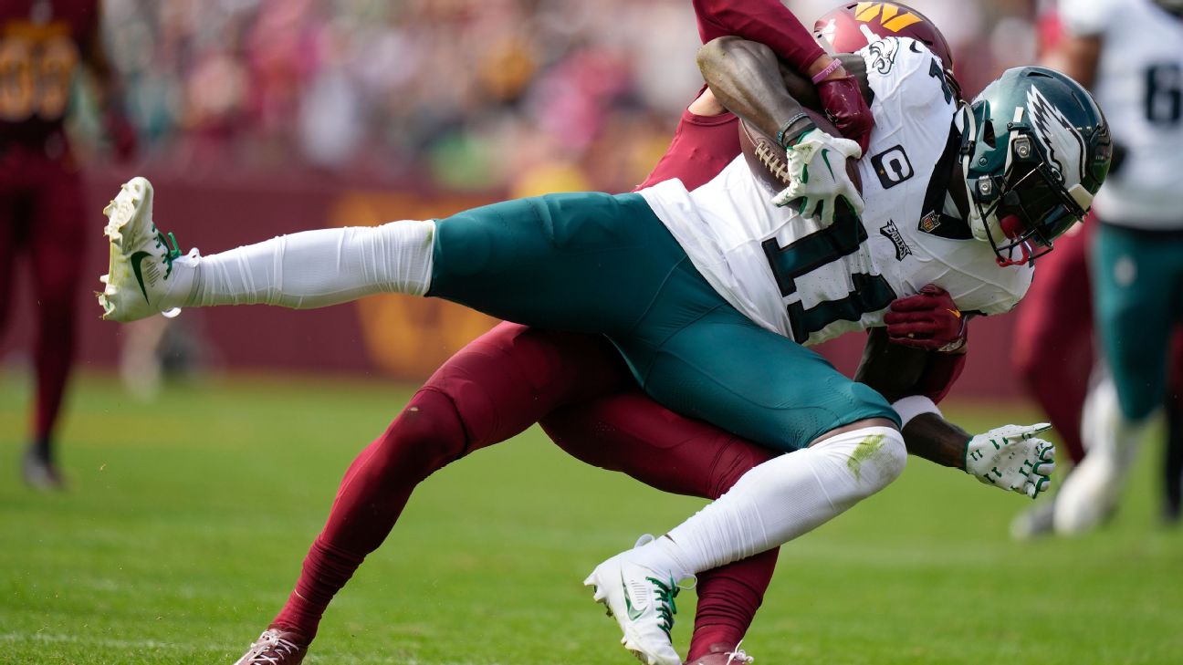 Brown's touchdown late in the second quarter brought back memories of Johnson. With the Eagles set up at the Commanders' 16-yard line, quarterback Jalen Hurts dropped back on first down and tossed a pass to the left corner of the end zone. Brown was well-covered byBenjamin St-Juste-- he had just 0.7 yards of separation at the time of the catch, per ESPN Stats & Information -- but he leapt and snared the ball one-handed before falling to the ground to cut Washington's lead to four.