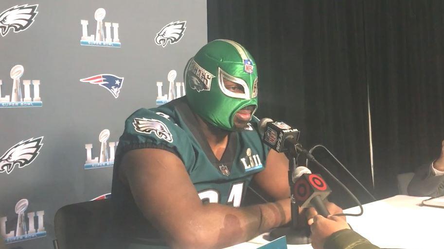 Shortly after the Philadelphia Eagles defensive tackle sat down at his seat, a reporter from Mexico bestowed Cox with a Lucha Libre mask, a skin-tight faade that covers the entire head, only revealing the eyes and mouth. The masks were popularized by wrestlers south of the border and made their way into U.S. popular culture with the 2006 movie "Nacho Libre," starring Jack Black.
