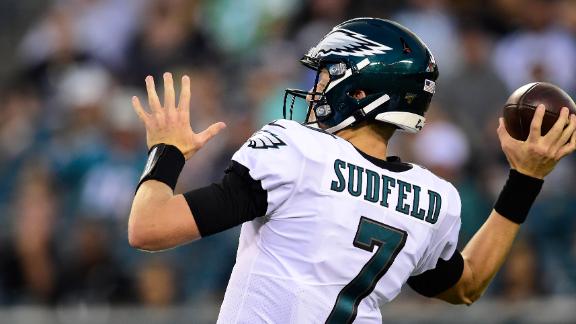 Nate Sudfeld broke his left wrist on a late hit in the second quarter of Philadelphia's 27-10 loss to the Tennessee Titans on Thursday night. Sudfeld is scheduled for surgery Friday morning, but Eagles coach Doug Pederson said the injury is not season ending and the team doesn't plan to add another quarterback.