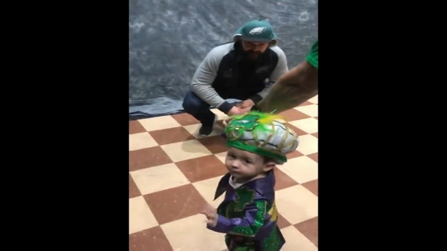 At almost 2 years old, his birthday is next month, Landon came dressed in the same Mummers attire when he met Kelce at the Philadelphia Sports Card and Memorabilia Show at Valley Forge Casino.