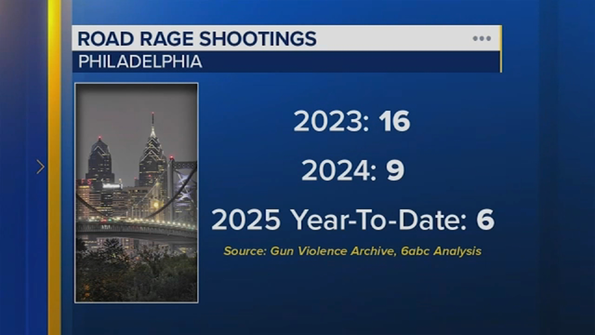 Data compiled by 6abc shows road rage shootings spiked to 16 incidents in 2023. There were nine in 2024, and so far this year, six have been reported.