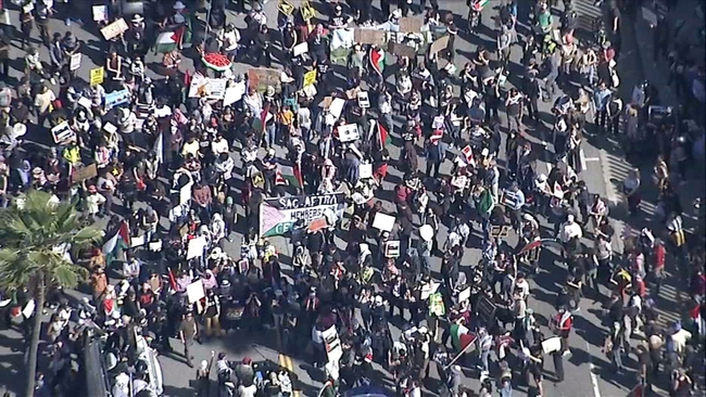 Nearby the Oscars at the Cinerama Dome, demonstrators have lined the streets to protest and call for a cease-fire in Los Angeles.