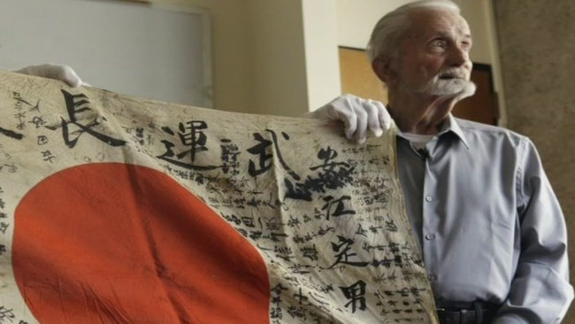 Marvin Strombo, who had taken the calligraphy-covered Japanese flag from a dead soldier at World War II island battlefield 73 years ago, returned it Tuesday to the family of Sadao Yasue. They had never gotten his body or - until that moment - anything else of his.